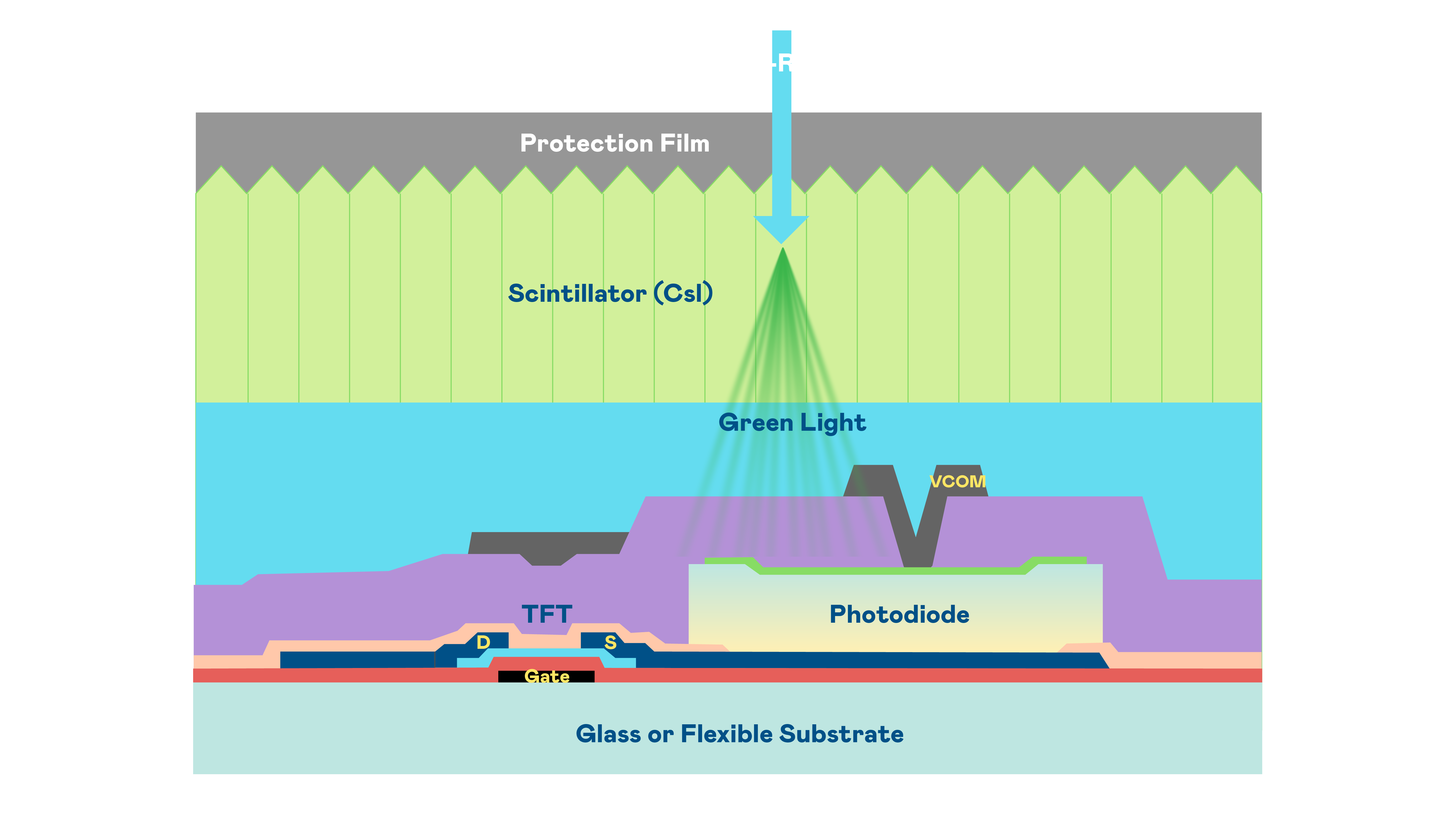 永利yl23411的X光影像感测阵列使用薄膜电晶体 (TFT) 作为每个像素的读取开关,搭配光电二极体(Photodiode)的光电转换元件,用以感测X光影像讯号。
